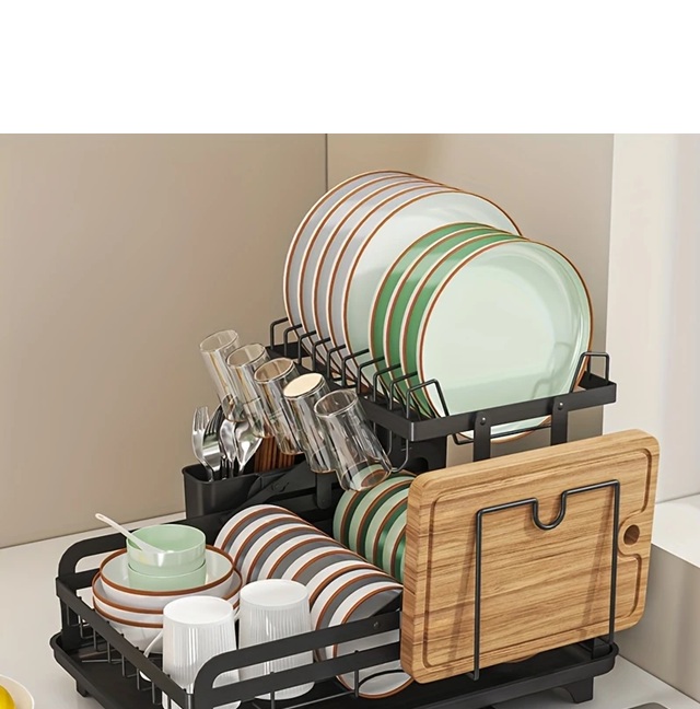 Rack de Secagem de Pratos com Drenagem, Grande com 2 Andares, Suportes de Metal com Drenagem, Suporte para Copos, Suporte para Utensílios e Tapete de Secagem Extra, Drenos de Pratos para Bancada de Cozinha, Preto, Branco e Cinza